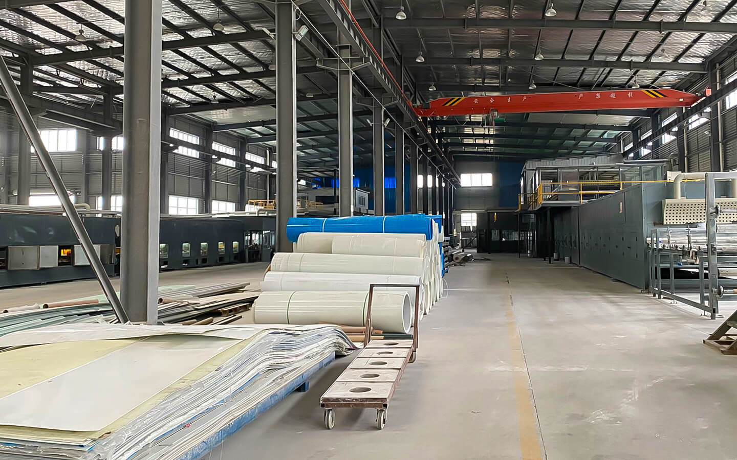 泰州中盛機電有限公司在引進(jìn)消化美國FRP自動化板材生產(chǎn)線的基礎(chǔ)上,生產(chǎn)具有高鋼性、高韌性、強耐腐性、耐候性的FRP板材。